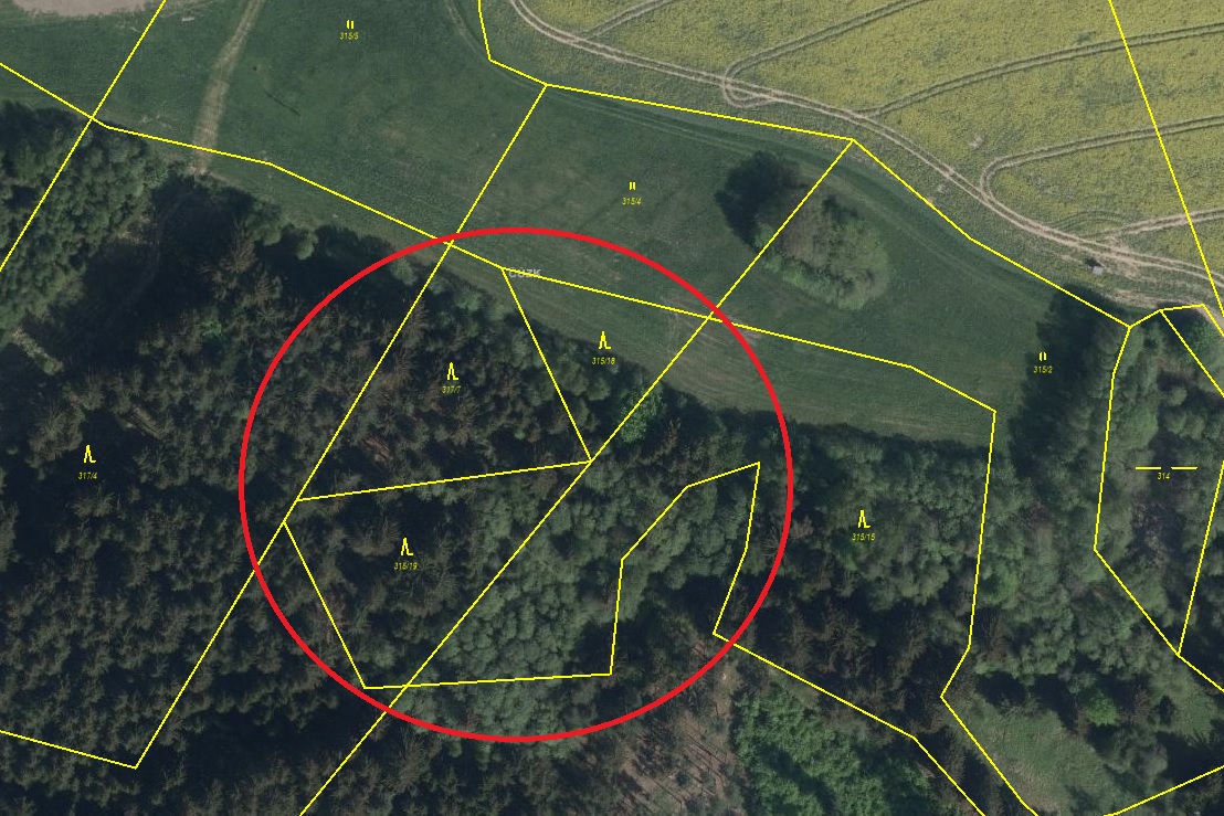 Prodej 3 lesních pozemků o celkové výměře 5827 m2, zapsaných na LV č. 152 v k.ú. Janovice u Houserovky.